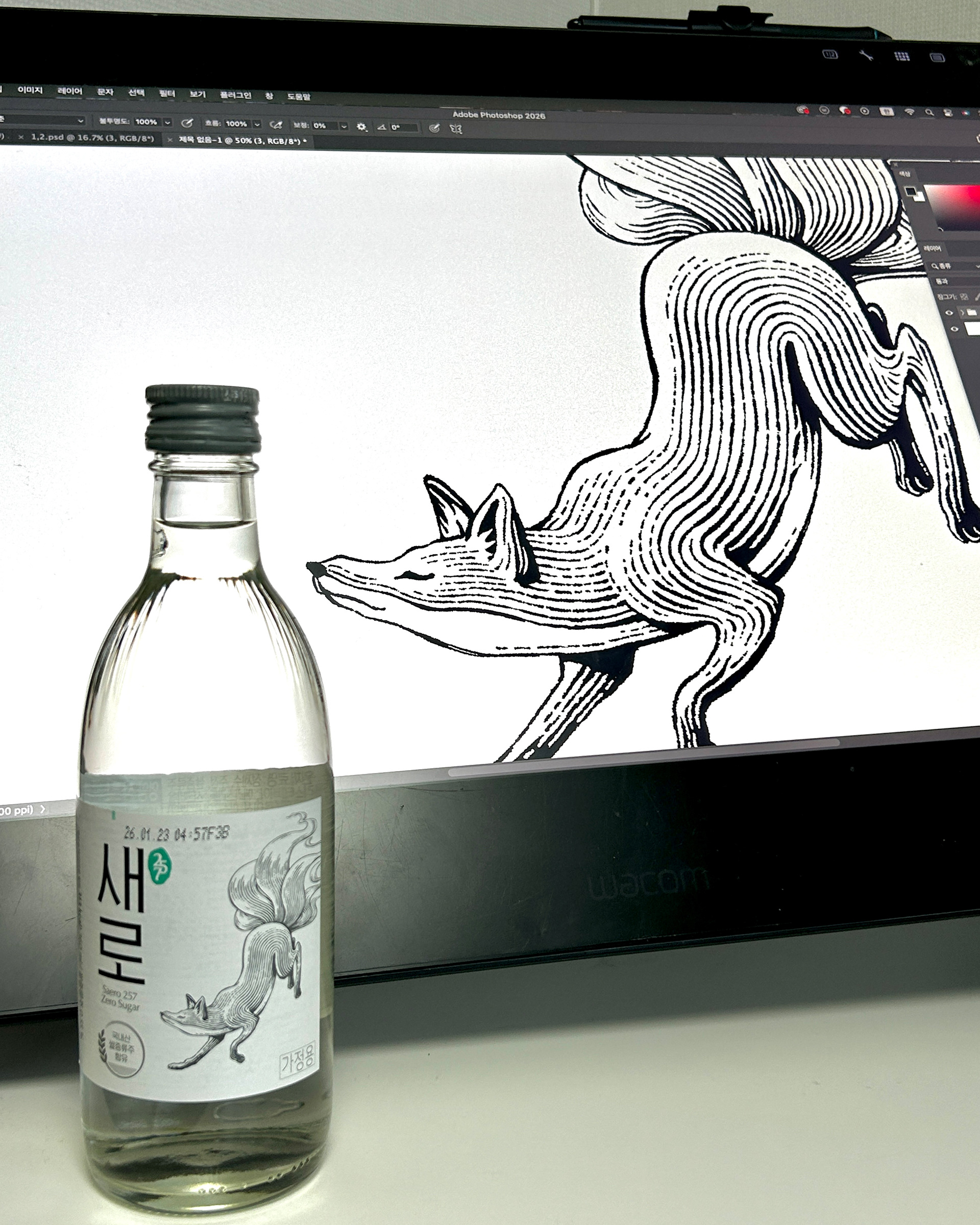 I was responsible for the label illustration, focusing on depicting the 'Gumiho' (nine-tailed fox), which is the core brand identity of Saero.